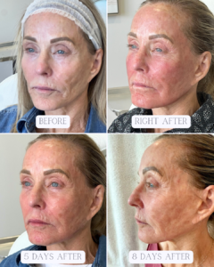 • A light CO2 treatment, uses lower laser energy and treats a fraction of the skin’s surface at a time. This is ideal for improving fine lines, mild texture concerns, enlarged pores, and pigmentation. Recovery typically involves about 5–7 days of redness, swelling, sensitivity, and mild peeling—allowing clients to return to their normal routine fairly quickly.